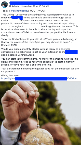 The example below is from a family who was going to a sensitive location. For Giving Tuesday they set a specific goal of $1,000 to go to pre-school and language learning. They promoted throughout the day (and prior!) by posting multiple times it on their Secret Facebook Group, which was comprised of people who were already a part of their team either in prayer and/or finances. They also created a post prior to Giving Tuesday on their regular Facebook page, asking if anyone was interested in hearing more about their journey. Then they added those interested parties to their Secret Facebook Group so that they could see the posts. BRILLIANT.