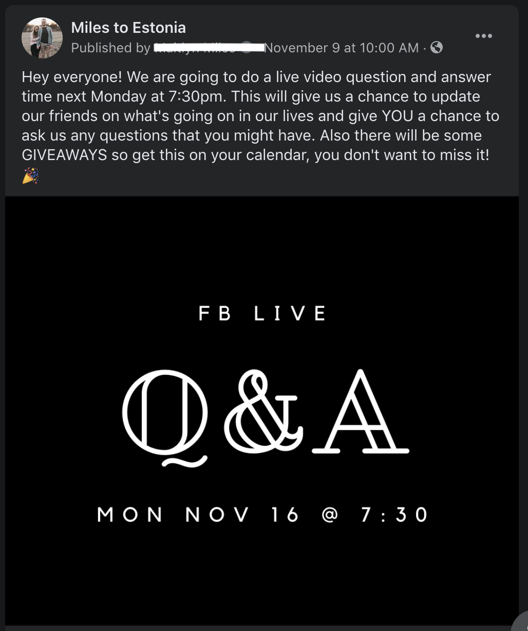 The main content of a FB Live Q&A should be comprised of giveaways, trivia / info on your assignment, questions for the audience, and time to let them as you questions. Make it simple and fun, and promote it however you can before hand. Consider doing one somewhere towards the beginning-ish of November. Here are some thoughts on a Facebook Live from a worker who did one last year: